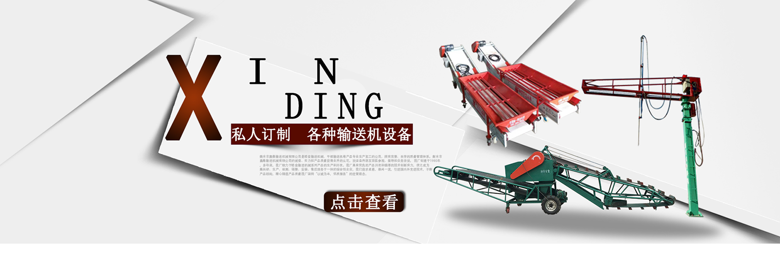 衡水市鑫鼎輸送機械有限公司是糧食輸送機械、平板輸送機等產品專業(yè)生產加工的公司,擁有完整、科學的質量管理體系。衡水市鑫鼎輸送機械有限公司的誠信、實力和產品質量獲得業(yè)界的認可。歡迎各界朋友蒞臨參觀、指導和業(yè)務洽談。 我廠創(chuàng)建于1980年,多年來,我廠致力于糧食輸送機械系列產品的生產和開發(fā)。我廠具有優(yōu)良的產品開發(fā)和雄厚的技術創(chuàng)新實力,使之成為集科研、生產、檢測、銷售、安裝、售后服務于一體的綜合性企業(yè),我們追求卓越,崇尚一流,引進國內外先進技術,不斷產品結構,精心鑄造產品質量我廠堅持“以誠為本,優(yōu)質服務”的經營理念。。積極拓展市場,贏得了廣大客戶的信賴和一致好評。產品暢銷山西、山東、遼寧、黑龍江、吉林、北京、天津、內蒙古等28個省、市、自治區(qū)。